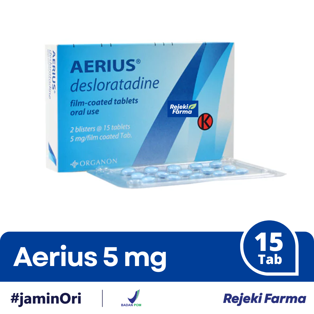AERIUS 5 MG 15 TABLET mengandung zat aktif Desloratadine yang merupakan obat golongan antihistamin yang bertindak sebagai inverse agonist selektif histamin perifer H1-reseptor. Obat ini digunakan untuk mengobati berbagai jenis alergi misalnya rhinitis alergi dan nasal congestion. Desloratadine termasuk anti histamin non sedatif sehingga menyebabkan lebih sedikit efek sedasi dan gangguan psikomotor dibanding golongan antihistamin lama karena jumlah obat yang menembus sawar darah otak hanya sedikit. Oleh karena itu, obat ini tidak menyebabkan kantuk.