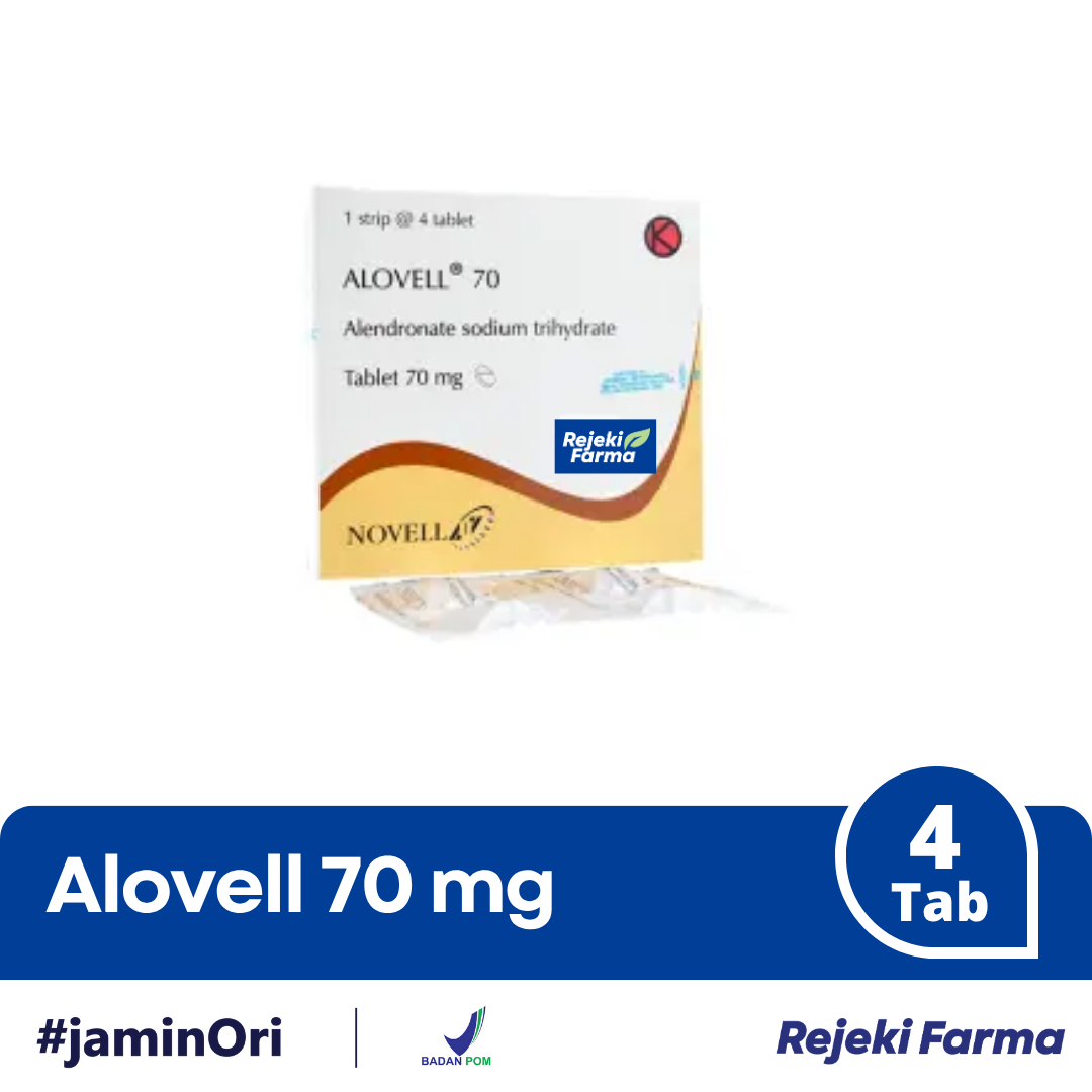 Alovell 70 mg - 1 Strip isi 4 Tablet adalah tablet yang mengandung Alendronate sodium, digunakan untuk mengobati dan mencegah osteoporosis, terutama pada wanita pascamenopause, serta membantu meningkatkan kepadatan tulang dan mengurangi risiko patah tulang.