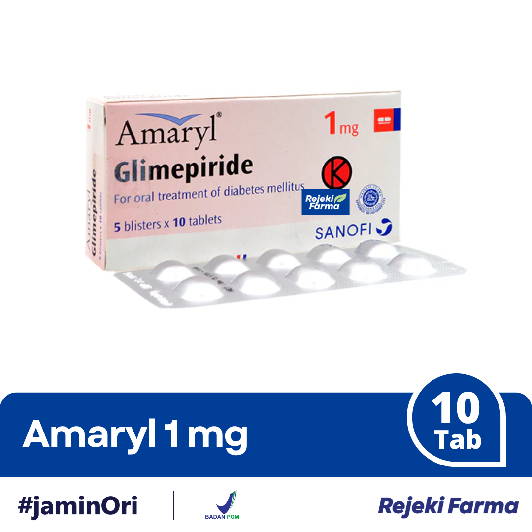 Amaryl 1 mg - 1 Strip isi 10 Tablet adalah obat yang mengandung glimepiride, digunakan untuk membantu mengontrol kadar gula darah pada pasien diabetes melitus tipe 2, terutama jika tidak cukup hanya dengan diet dan olahraga.